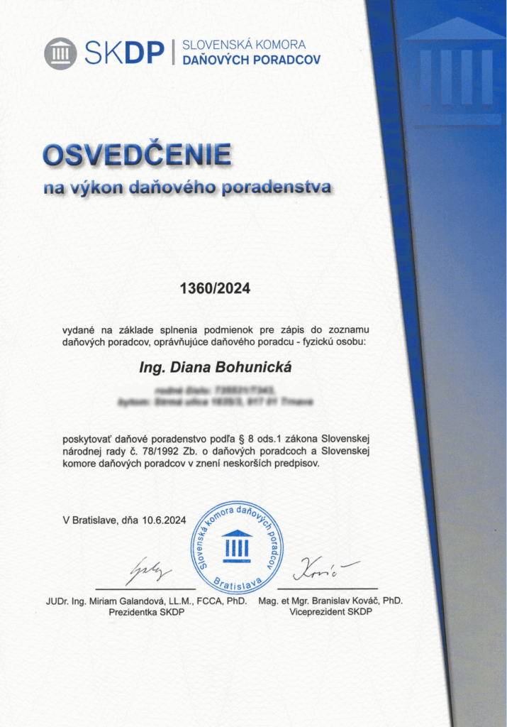 Osvedčenie na výkon daňového poradenstva 1360/2024